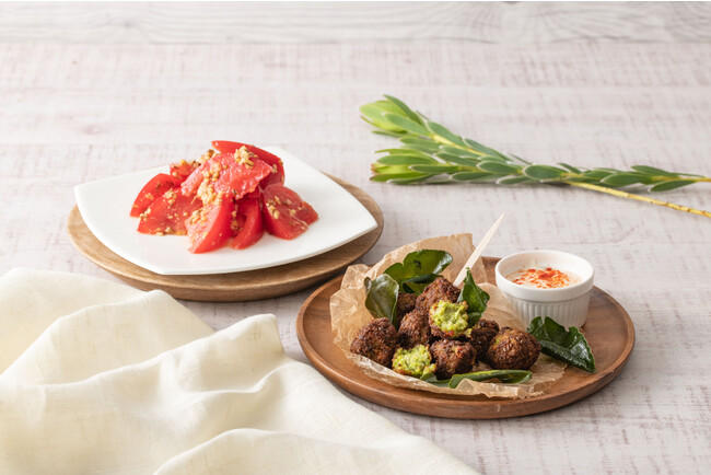 中近東のソウルフード“ファラフェル”を日本の夏野菜“枝豆”で作った風味豊かなフリット。サクサク食感がクセになるライムリーフの素揚げで爽やかさをプラス!お好みで豆乳ヨーグルトソースにディップしてお召し上がりください。