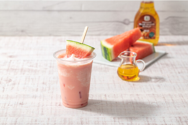 スイカのジューシーな果肉と植物性のアガベシロップ、豆乳を使用した夏にぴったりなヴィーガンスムージー。フレッシュのスイカも添えて満足感のある一杯。