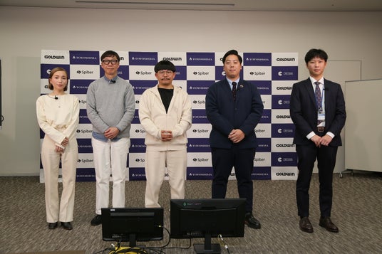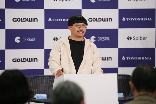 「Spiberは2007年に山形県鶴岡市で創業したバイオベンチャー。生産拠点としてタイにも工場を設立しており、累積1,000億円程度の資金調達を行っている。2015年にゴールドウインさんからの出資を受け、アパレル向けの繊維開発によりフォーカスをした。2020年には豊島さんからの出資を受け、量産化を進めたことで、ようやく日本のお客さまにも手にとっていただける段階にきている」と述べ、自身が今着用しているのが、豊島と開発した自社の繊維を使った商品である、2023年9月にゴールドウインから発売されたシャツと、同年12月にロンハーマンから発売されたフーディー・パンツであると、自らモデルになってご紹介されました。