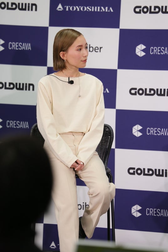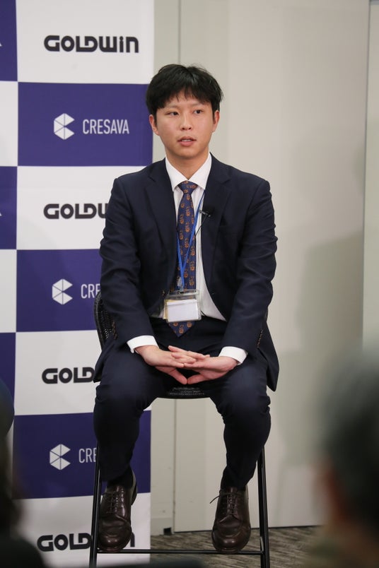 新井さんはSpiberとの取り組みのきっかけについて、「2014年にゴールドウインの代表取締役社長 渡辺 貴生と鶴岡市を訪れる機会があり、先進的な考え方や将来へのモチベーションに感銘を受けて、一緒に将来を作っていこうと、2015年に取り組みをスタートした」と当時を振り返りました。また、商品化までの道のりについて「これまで世の中になかった素材のため、未経験のことが多く、魅力的な製品にしていくまでの段階ですべてにおいて難しかった」と語りました。一方、枡野さんは、「幅広い方が商品を着ていただく段階となり、機能性や耐久性といった着やすさと、環境負荷を下げるという点の両立について手探りをしている日々」だと、供給側の苦労をにじませました。