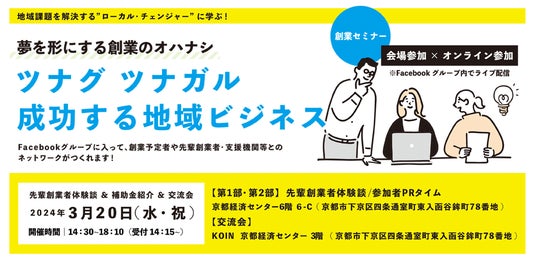 株式会社ツクリエ(本社:東京都千代田区 代表取締役:鈴木英樹 以下、ツクリエ)が運営協力を行う、京都府が主催の『創業セミナー「ツナグ・ツナガル・成功する地域ビジネス」夢を形にする創業のオハナシ(以下、創業セミナー)』が、3月20日(水・祝)に京都経済センター(京都市下京区)にて開催されます。