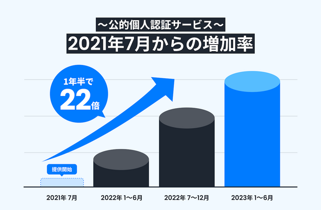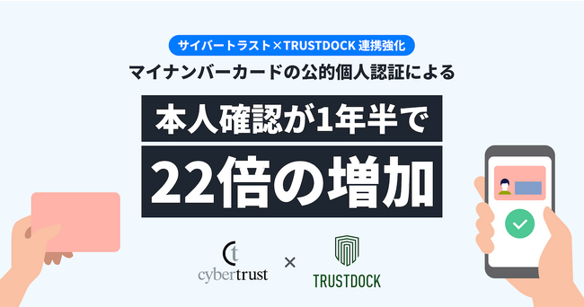 株式会社TRUSTDOCK(本社:東京都千代田区、代表取締役:千葉 孝浩、以下 TRUSTDOCK)とサイバートラスト株式会社(本社:東京都港区、代表取締役社長:北村 裕司 以下、サイバートラスト)は、行政や民間企業へ提供している公的個人認証サービスについて、両社が提供を開始した2021年7月から12月に対して、2023年1月から6月の同期間の実績が約22倍に増加したことを発表します。