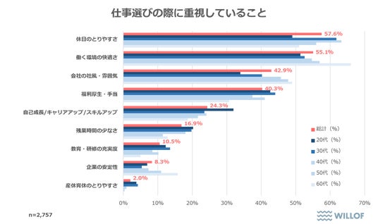 次に【仕事選びの際に仕事内容・給与・勤務地以外で重視するポイント】について聞いたところ、「休日の取りやすさ(57.6%)」が最も多く、年代別で見ると30代(61.8%)と40代(63.3%)で相対的に高い結果となりました。次いで「働く環境の快適さ(55.1%)」となり、特に60代(66.0%)で高い結果となりました。