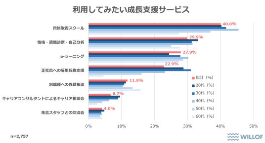 最後に【利用してみたい成長支援サービス】について聞いたところ、「資格取得スクール」が40.0%で最も多くなり、年代別で見ると特に40代の回答率(45.4%)が高くなりました。2番目に多かったのは「自己分析ツール(29.9%)」で特に20代の選択率(33.1%)が高くなり、20代の派遣社員は自身の特徴や強みなどの適性について、分析したいと感じていることがわかります。また「正社員への雇用転換支援」は22.9%で631名の派遣社員が選択しました。特に20代(28.8%)と30代(31.0%)での選択率が高い結果となりました。