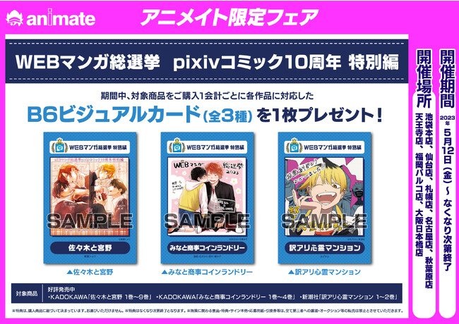 また、アニメイト約110店舗にて上位10作品を店頭で紹介するとともに、一部の対象店舗では上位3作品を購入した方に記念の限定B6ビジュアルカードを配布します。