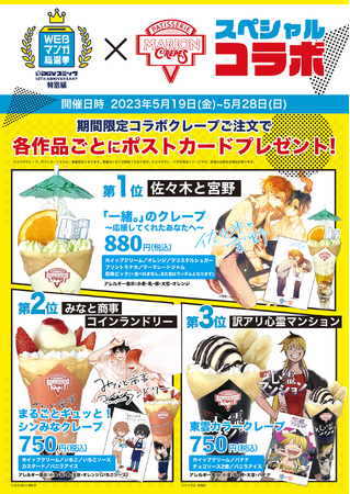 マリオンクレープの一部店舗にて、「WEBマンガ総選挙 pixivコミック10周年 特別編」1~3位受賞作品をイメージした特別メニューを販売いたします。コラボクレープをご注文いただいた方に、各作品ごとのオリジナルポストカードをプレゼントいたします。