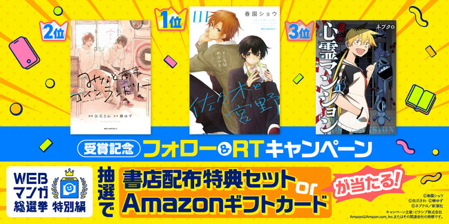 「WEBマンガ総選挙 pixivコミック10周年 特別編」での受賞を祝ってTwitterキャンペーンを実施します。期間中にpixivコミック公式Twitter(https://twitter.com/pixivcomic)をフォローし、対象ツイートをリツイートした方の中から抽選で合計60名様に、書店特典セットやAmazonギフトカードをプレゼントします。