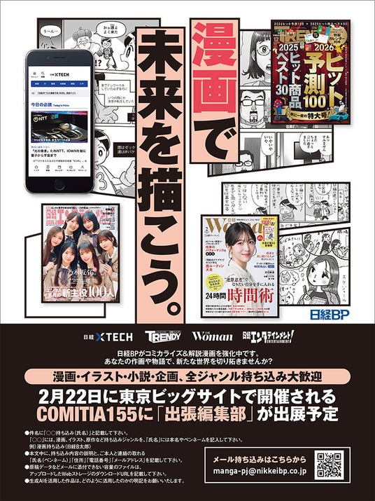 2026年2月22日、東京ビッグサイト(東4・5・6ホール)で開催する創作同人誌即売会「COMITIA155(コミティア155)」に、日経BPが出張編集部として初出展します。書籍や企画記事のコミカライズ、ストーリーを重視した解説漫画など幅広いジャンルで、意欲とパワーがある作家を大募集します!
