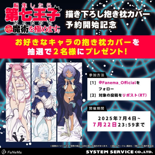システムサービス株式会社(本社:東京都豊島区、代表取締役社長:田村宗弘)は、アニメ・マンガ・ゲーム作品等のキャラクター商品の企画・製作・販売をする自社ECサイト「FaNeMa」(URL:https://fanema.jp/)にて、TVアニメ『転生したら第七王子だったので、気ままに魔術を極めます』より「抱き枕カバー」の再受注販売をいたします。