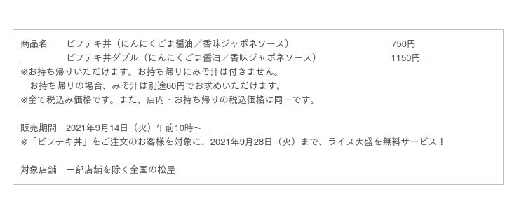 このたび松屋フーズ(本社:東京都武蔵野市、代表取締役社長:瓦葺一利)は、牛めし・カレー・定食・その他丼の「松屋」におきまして、2021年9月7日(火)より販売中の「ビフテキ丼(にんにくごま醤油)」に加え、2021年9月14日(火)より「ビフテキ丼(香味ジャポネソース)」の販売を開始いたします。