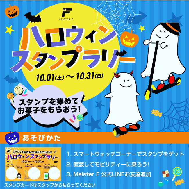 沖縄県のMESTER.Fショップうるま店とパルコシティ店は、2022年10月1日(土)~10月31日(火)まで、ハロウィンスタンプラリーを開催します。スタンプラリーの完了と電動モビリティの試乗、MESTER.F公式LINEのお友達追加、もしくはInstagramの公式アカウントフォローでお菓子の詰め合わせをプレゼントします。