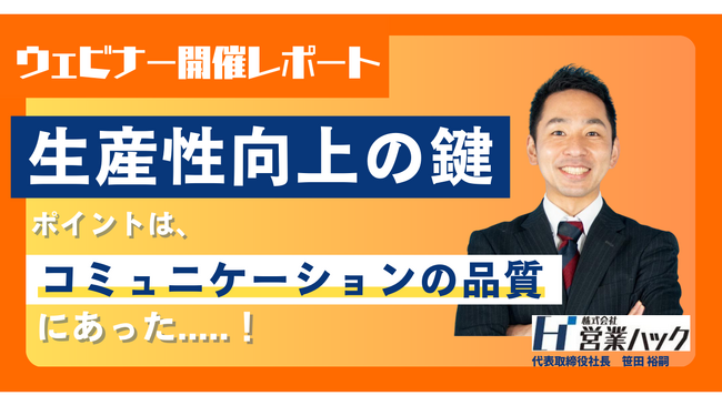 株式会社営業ハック(本社:東京都港区・代表:笹田裕嗣)とany株式会社(本社:東京都千代田区・代表:吉田和史)が共催でランチタイムショートウェビナーを行いました。日時は2023年5月23日(火)12:00~12:30、参加費は無料です。少子高齢化が進む社会において、どの組織も直面している「生産性」の問題。近年はそれに伴い、「時間生産性」「タイムパフォーマンス」がトレンド用語として登場しました。