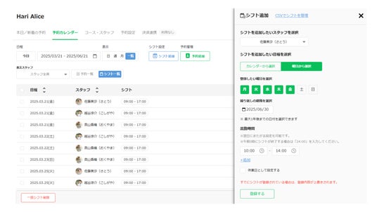 スタッフのシフト管理から予約受付、予約・キャンセル時の自動通知、リマインドメッセージ送信、事前質問設定、料金決済まで、予約に必要な機能を一括管理できます。