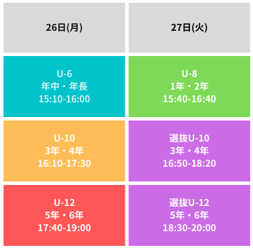 ※U-10の通常スクールは、火曜日が定員に達しているためキャンセル待ちでのご案内となります。