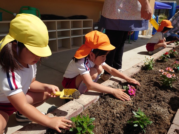緑資金ボランティアでは地域の幼稚園や小学校での緑化活動を支援し、子供達に花や土に触れ合い自然について学ぶ機会を提供するとともに、コメリの従業員へボランティアの場を提供しています。