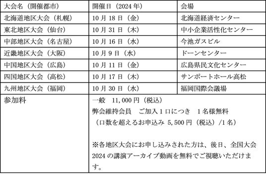 全国/地区いずれの大会も、お申込みの特典として、後日、全国大会の講演動画を無料でご視聴いただけますので、どうぞ今からスケジュールの確保をお願いいたします。