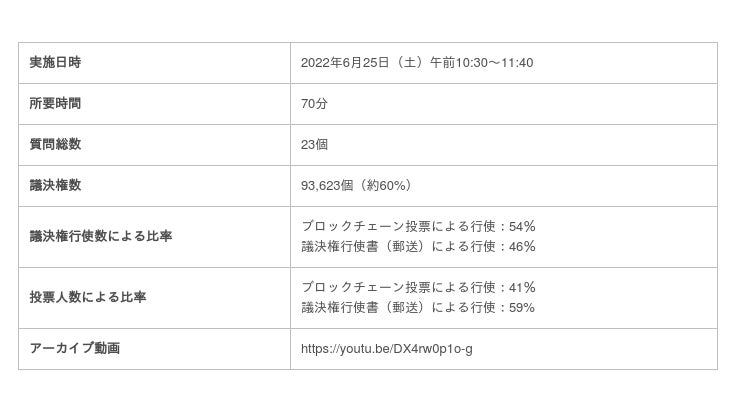 当社は、2022年6月25日開催の第24回定時株主総会および取締役会において、役員の体制が以下の通り決議されましたのでお知らせします。また、ブロックチェーン技術を基盤とした「場所の定めのない株主総会」(以下、バーチャルオンリー株主総会)を実施した結果についても、以下によりご報告します。