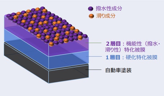 1層目の保護性能をさらに高めると同時に、しっとりとした濡れ艶感と滑らかな触り心地を実現。撥水性の向上により、水滴が転がるように流れ落ち、洗車後のふき取り作業を軽減します。