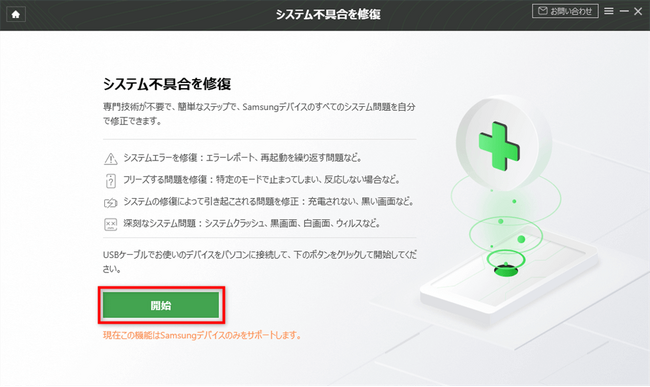 2.デバイスをパソコンと接続し、「開始」ボタンをクリックします。