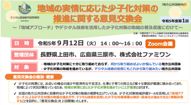 当意見交換会は、地域の少子化対策に十分に取り組めておらず、何から取り組めばよいか悩んでいる地方公共団体や少子化対策の取組を進めているが、デジタル技術の活用にこれから取り組みたい地方公共団体を対象にし、「地域アプローチ」による少子化対策の取組の進め方やデジタル技術を活用した少子化対策事業の検討・具体化の進め方を広く情報共有することを目的に開催します。
