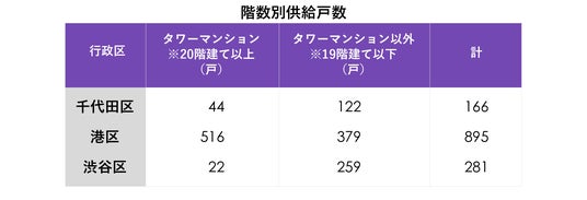 階数別供給戸数を見ると、港区の中古流通戸数が他の2区と比べ圧倒的に多いことが分かります。理由はタワーマンションの流通量が多いためで、港区の流通戸数の約6割がタワーマンションの流通です。港区は湾岸エリアをはじめ他の2区と比べるとタワーマンションの物件数自体も多く、流動性が高いタワーマンションが港区の流通量を牽引しています。