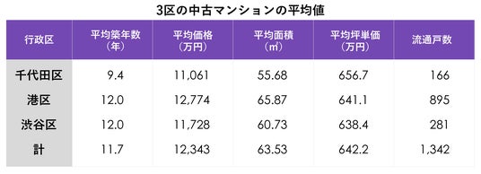 今回調査した千代田区、港区、渋谷区の平均値を見ると、平均的な物件像としては築年数が10年前後で面積は60平方メートル 前後、価格が1億2千万円前後、坪単価は650万円(1平方メートル あたり196万円)前後で3区ともに同じような傾向がみられます。