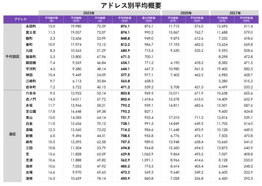 また、アドレス別に3年おき(2020年と2017年)の相場と比べると、2017年比で坪単価が最大+400万円(1平方メートル あたり約120万円)、2020年比で最大+300万円(1平方メートル あたり約90万円)程度上昇しているアドレスも見られるなど、大きく相場が上昇していることがわかります。全体的には2017年と2023年で約+200万円(1平方メートル あたり約60万円)、2020年と2023年で+100万円(1平方メートル あたり約30万円)程度の上昇がみられます。