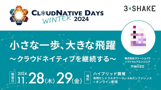 株式会社スリーシェイク(本社:東京都新宿区、代表取締役社長:吉田 拓真、以下スリーシェイク)は、2024年11月28日(木)・29日(金)に開催される「CloudNative Days Winter 2024」に出展および登壇することをお知らせします。