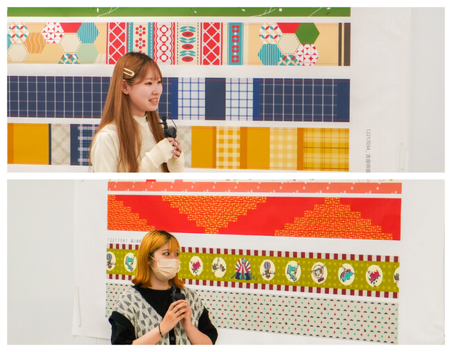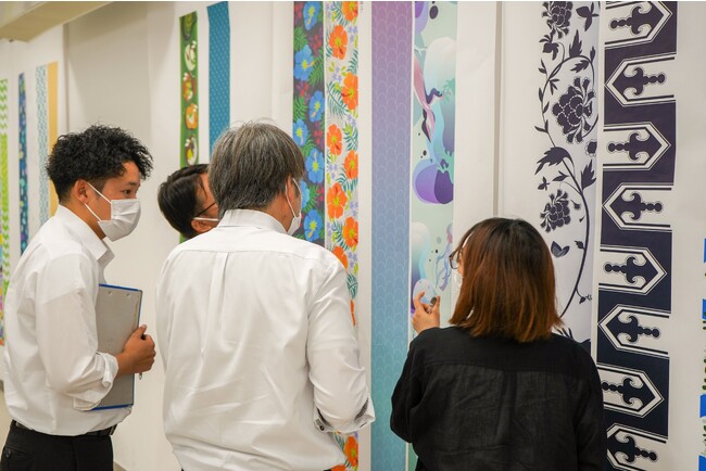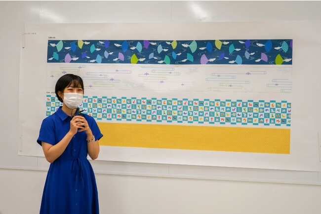 2023年5月末から7月初旬にかけて実施された第一回帯プロジェクトでは、「無地のタッサーシルク(野生の蚕の吐く糸を紡いで作ったシルクの一種)の着物に合う半幅帯」をテーマに、京都芸術大学のキャラクターデザイン学科2年生10名、3年生6名の計16名がデザインに挑戦しました。最終プレゼンでは、実寸サイズにプリントされた作品の前で発表が行われました。どの作品もアイデアが素晴らしく審査が難航したとのことですが、最終的に5名6作品が受賞しました。選ばれた作品は今後製品化され、12月初旬より小売店にて販売される予定です。