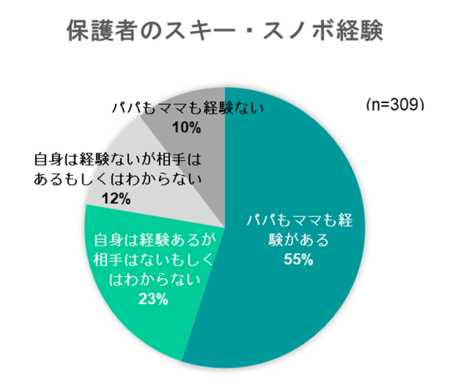 まず、保護者自身のスキーやスノーボードの経験有無を聞きました。パパ・ママ両方で経験があるという家族は55%で、パパ・ママのどちらかは経験があるという家族も合わせると8割弱と多い割合となっています。