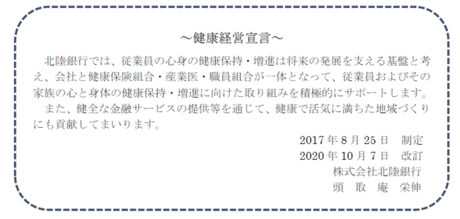 当行では頭取を健康管理責任者として、「健康経営宣言」を制定し、従業員およびその家族の健康保持・増進に繋げる諸施策に取り組んでおります。今後も引き続き、企業の持続的な成長の実現には従業員およびその家族の心身の健康が不可欠であるとの見地に立ち、健康保険組合、産業医および職員組合と連携して、従業員一人ひとりが自らの能力を最大限に発揮できる職場環境を整備し、組織全体の更なる活性化の実現およびSDGsの達成を目指してまいります。