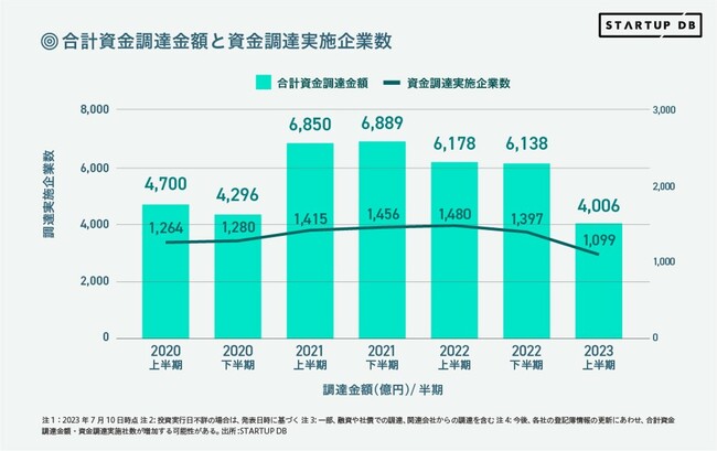 2023年上半期の資金調達金額は4,006億4,100万円でした。これは新株を発行するエクイティファイナンスだけでなく、融資などのデットファイナンス、それにクラウドファンディングによる調達などの総額です。