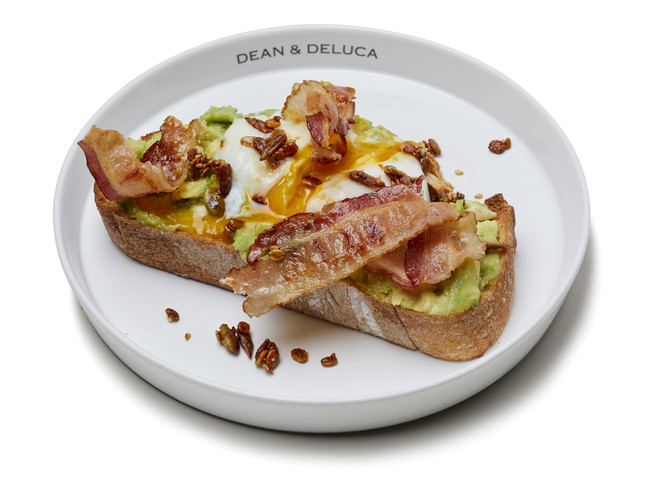 ロングセラーのアボカドトーストに、半熟卵とベーコンをトッピング。クリーミーなアボカドに、黄身がとろりと溶け出す半熟卵のコクと、カリカリに焼いたベーコンの歯ざわりとうま味が重なり、深い味わいと多彩な食感がたのしめます。