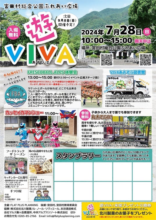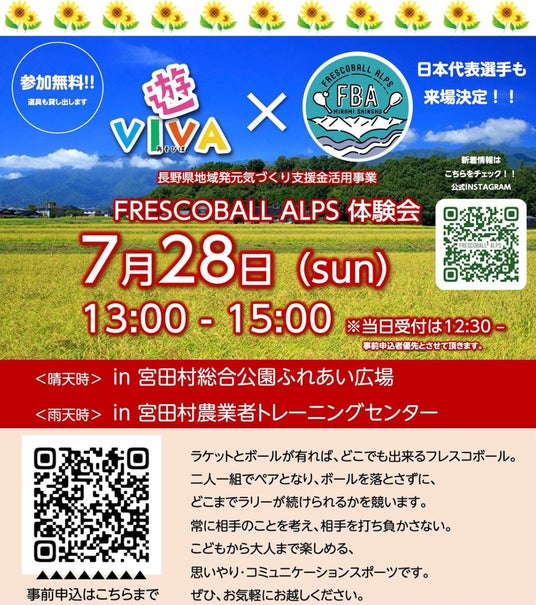 コミュニケーションデザインスポーツ ”フレスコボール" の国内における普及活動を行っている日本フレスコボール協会(以下 JFBA、代表理事 窪島剣璽)は、公認地域クラブの「FRESCOBALL ALPS」(長野県駒ヶ根市)が、7月28日(日)に宮田村総合公園ふれあい広場で定期的に開催しているイベント『遊VIVA』とコラボしたフレスコボール無料体験会を実施することを発表いたします。