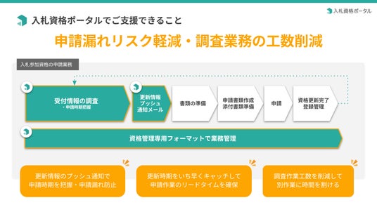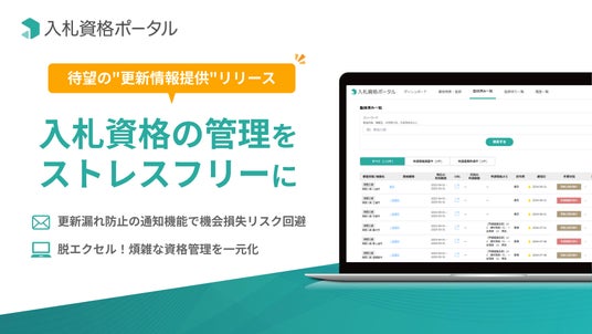 今後も「入札資格ポータル」では、約6,800種類もある「入札参加資格」の管理におけるさまざまな課題を解決すべくサービスの拡充に努め、入札資格の管理をストレスフリーにするとともに、入札マーケットの拡大と活性化に貢献してまいります。