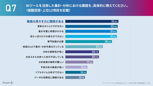 7.BIツールを活用した集計・分析の課題、第1位「画面の見やすさ」、第2位「更新のタイムラグ」