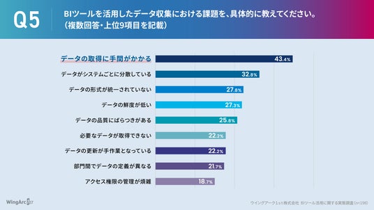 5.BIツールを活用したデータ収集の課題、第1位「データ取得が手間」、第2位「データがシステムごとに分散」