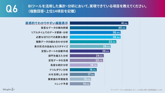 6.BIツールを活用した集計・分析で実現できていること、4割以上が「直感的でわかりやすい画面表示」や「容易なデータの傾向把握」と回答
