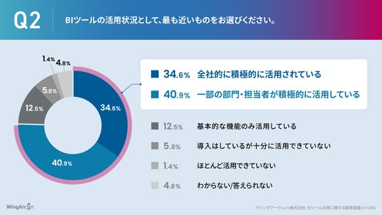 2.BIツールの活用状況、34.6%が「全社的に積極的に活用」、40.9%が「一部の部門・担当者が積極的に活用」と回答