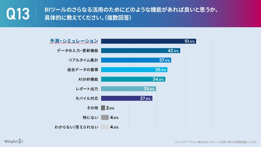 Q2で「わからない/答えられない」以外を回答した方に、「Q13.BIツールのさらなる活用のためにどのような機能があれば良いと思うか、具体的に教えてください。(複数回答)」(n=198)と質問したところ、「予測・シミュレーション」が51.5%、「データの入力・更新機能」が42.9%という回答となりました。