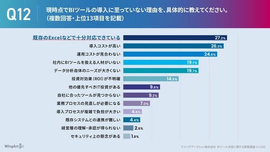 Q1で「導入を検討している」「導入予定はない」と回答した方に、「Q12.現時点でBIツールの導入に至っていない理由を、具体的に教えてください。(複数回答)」(n=228)と質問したところ、「既存のExcelなどで十分対応できている」が27.2%、「導入コストが高い」が26.3%という回答となりました。