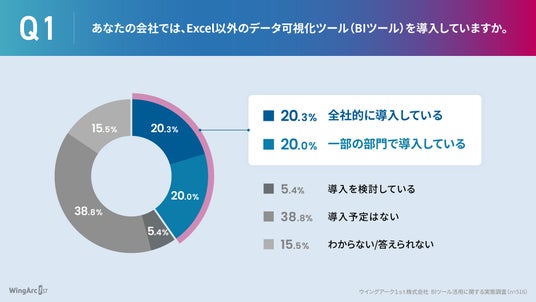 「Q1.あなたの会社では、Excel以外のデータ可視化ツール(BIツール)を導入していますか。」(n=516)と質問したところ、「全社的に導入している」が20.3%、「一部の部門で導入している」が20.0%という回答となりました。