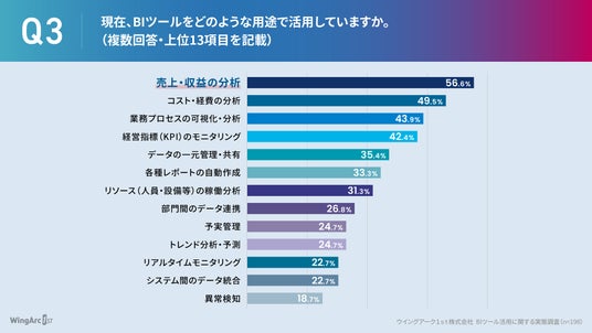 Q2で「わからない/答えられない」以外を回答した方に、「Q3.現在、BIツールをどのような用途で活用していますか。(複数回答)」(n=198)と質問したところ、「売上・収益の分析」が56.6%、「コスト・経費の分析」が49.5%という回答となりました。