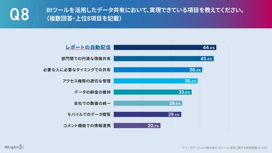 8.BIツールを活用したデータ共有で実現できていること、「レポートの自動配信」や「部門間での円滑な情報共有」が上位