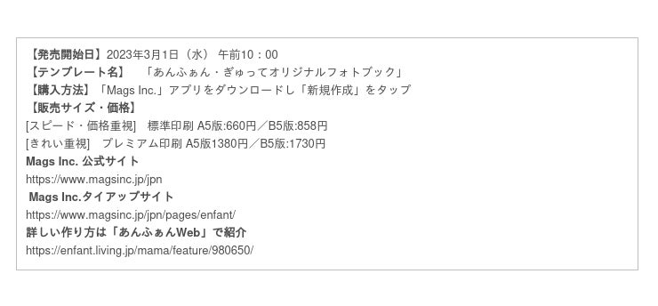 園児とママ・パパの情報誌「あんふぁん」「ぎゅって」を展開する株式会社こどもりびんぐ(代表取締役社長:中島一弘/東京都千代田区)では、株式会社ひけしや(代表取締役社長:槇俊徳/神奈川県横浜市中区)が提供するフォトブック作成アプリ「Mags Inc.(マグズインク)」とコラボし、あんふぁん、ぎゅってオリジナルフォトブックのテンプレートを3月1日(水)にリリースしました。