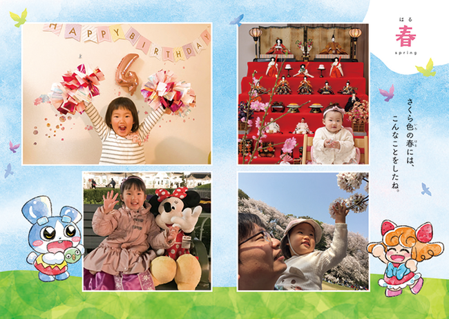 オリジナルテンプレートデザインには、「あんふぁん」「ぎゅって」の人気連載「できたて!ポンチポンチ」のキャラクターを採用。同作のおはなし風に作られたページに25枚の写真を当てはめると、世界にひとつだけのわが子が主人公の絵本風フォトブックが完成。四季をイメージしたページがあり、入れられる写真は1シーズン4枚。16枚選ぶとあっという間に春夏秋冬の記録ができあがります。途中保存が可能なので、忙しいママも家事やスキマ時間で作成が可能です。