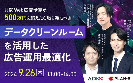 株式会社PLAN-Bおよび株式会社PLAN-Bマーケティングパートナーズ (東京都品川区、代表取締役:鳥居本真徳)と株式会社ADK マーケティング・ソリューションズ (本社:東京都港区、代表取締役社長:大山 俊哉)は、2024年9月26日(木)13:00~14:00に「データクリーンルームを活用した広告運用最適化」をテーマに共催セミナーを実施いたします。