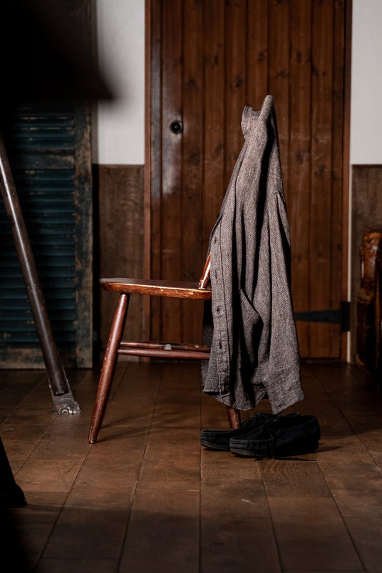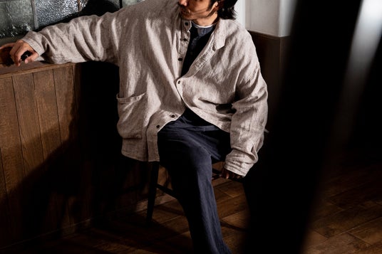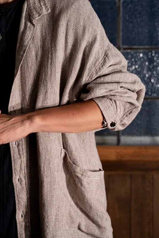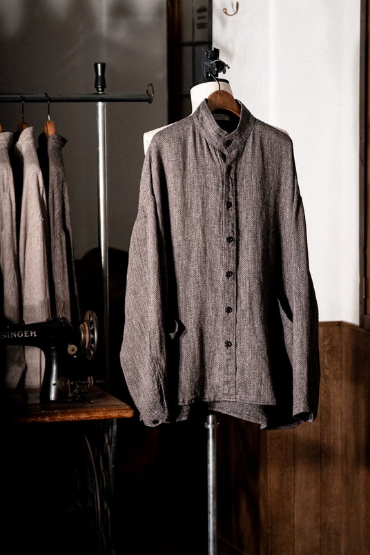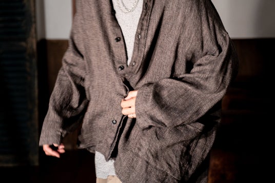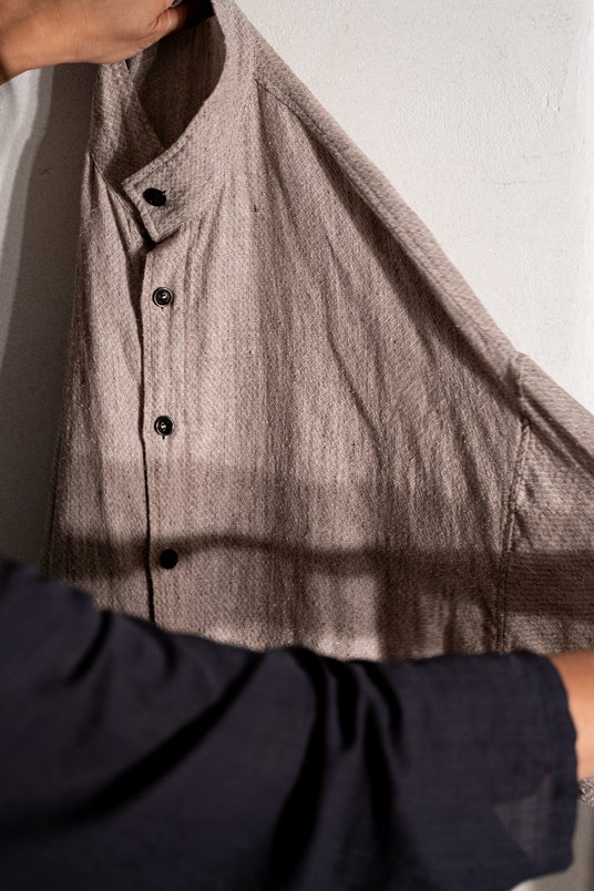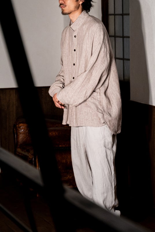 シルクネップを含む紬糸を打ち込み、ジャガード織機で複雑に織り合わせたことでネップが際立つリネンベースのファブリックを製作。20世紀初頭のユーロ農夫のカバーウェアとなるスモックをソースに、シンプルなシャツアウターに仕立てました。すっぽりと覆う、これぞスモックというオーバーサイズのシャツです。