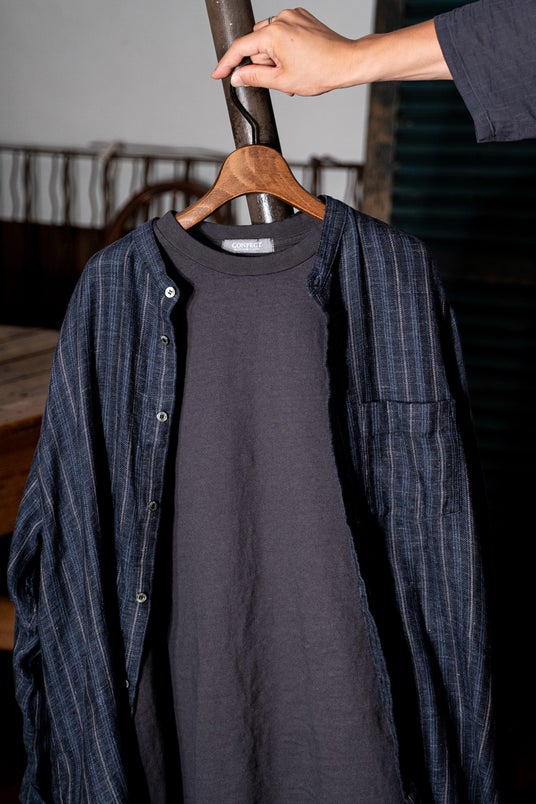 リネンシルクの振り切れたサイズのスモックと日本の織物らしい細やかな色分けがなされた生地で作るストライプシャツ。