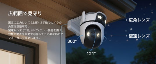 「Tapo C545D」は、165°の視野角を持つ固定レンズ(広角)と、パンチルトレンズ(6mm望遠)を備えたデュアルレンズ搭載カメラです。同時に2方向を映しだすことで、広範囲をカバーしながら細部まで監視でき、より効率的なセキュリティ対策を可能にします。